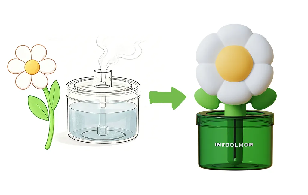 This flower-shaped humidifier was developed as a custom homeware product, covering appearance design, structural engineering, mold development, and mass production.