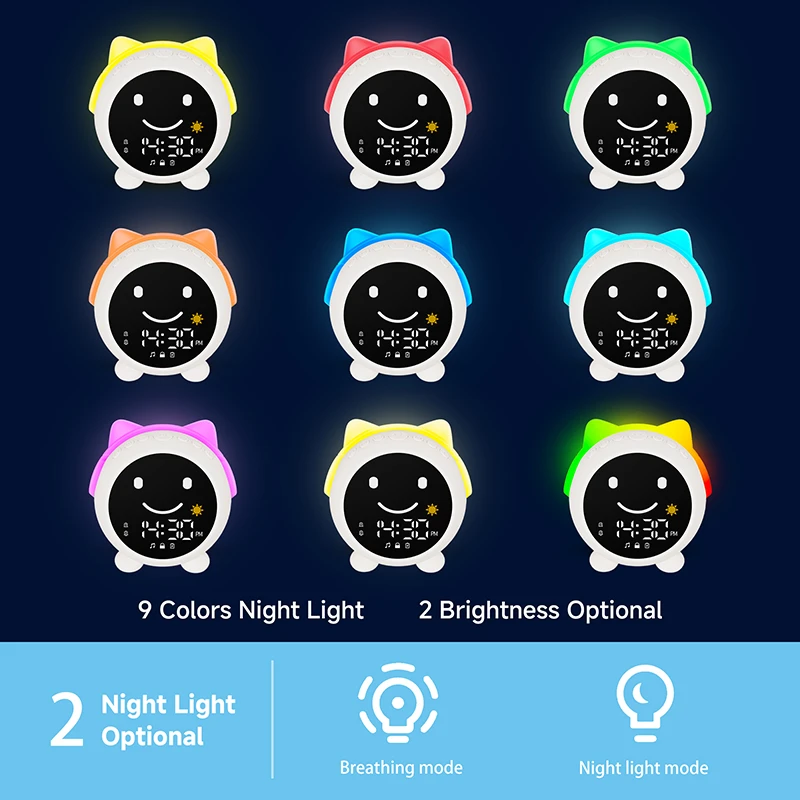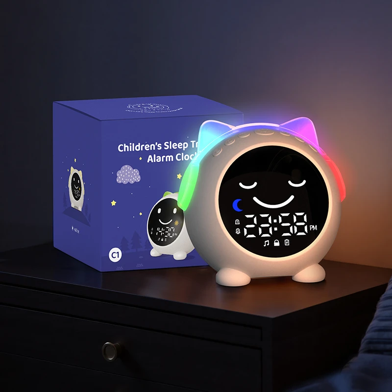 Kids Sleep Training Alarm Clock is a multifunctional bedside product that combines a digital alarm clock, sleep trainer, LED night light, Bluetooth music player, and sound machine in one compact and child-friendly design. It is developed to help toddlers and children build healthier bedtime and wake-up routines while also serving as a practical and decorative companion for bedrooms, nurseries, and family spaces.