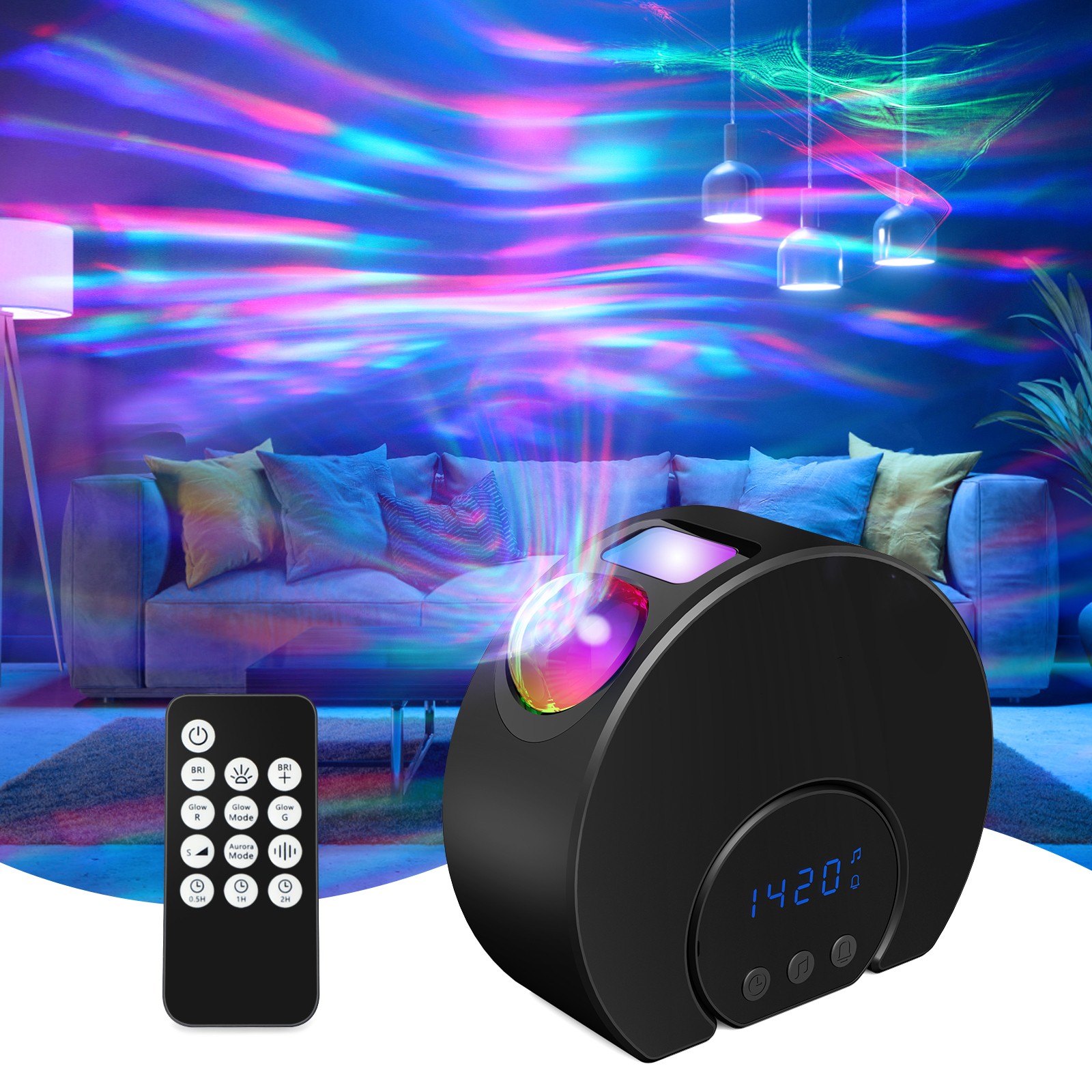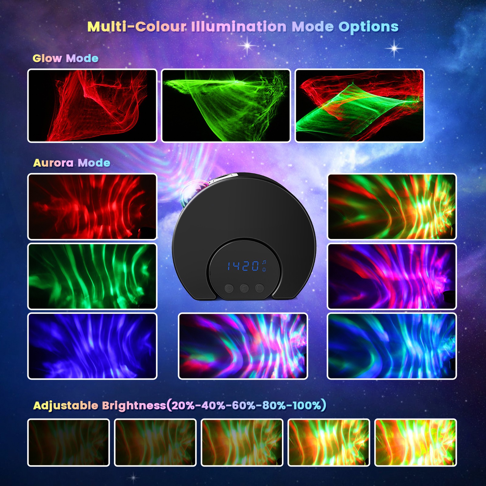 Immersive Northern Lights & Mood Lighting with Music Sync, Digital Clock, and Smart Alarm for Bedroom Ambiance.
